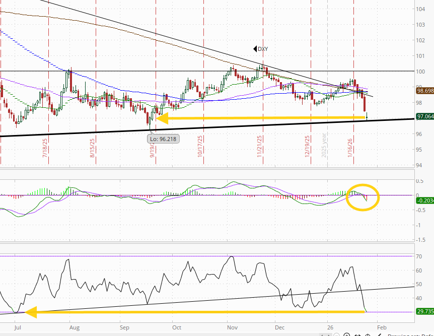 The weakening technicals I had noted Wednesday continued to point the way with the $DXY dollar index (which as a reminder is very euro heavy (57%) and not trade weighted) dropping another -0.6% Monday (now down -1.7% the past three sessions a big move and the most since April), to the lowest close since Sept and now right on the decade+ uptrend line (I had asked Friday (“Test of the uptrend line coming?”). Now that we’re there, does it bounce?