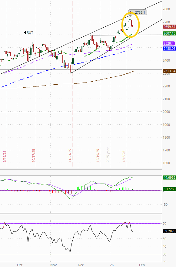 RUT (Russell 2000) remains the best chart of the bunch but increasingly less so with back-to-back losses. The MACD remains with a “go long signal,” but the RSI fell back to the least in a couple of weeks (I mentioned Thursday it had gotten to “levels that have seen the index stall out in the past year”).