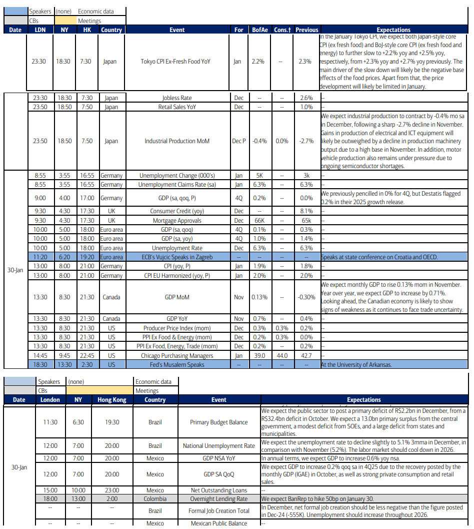Ex-US highlights are a policy decision from Columbia (a 50bps hike is expected), and quite a bit of data including Japan unemployment, retail sales, industrial production, and Tokyo CPI, Germany unemployment, GDP, and CPI, EU unemployment and GDP, Canada GDP, UK consumer lending, Mexico GDP, and Brazil unemployment.