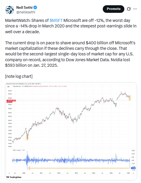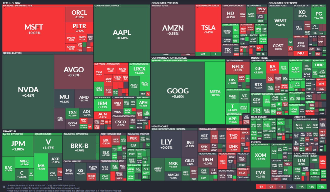 Just one sector down that much (Tech -1.9% led by MSFT -10.2%, but also PLTR -3.5%, PANW -4.2%, CRWD -5.2%, CRM -6.6, NOW -9.8%, ORCL -2.2%, etc.). Cons Discr was next -0.6% w/TSLA -3.5%.