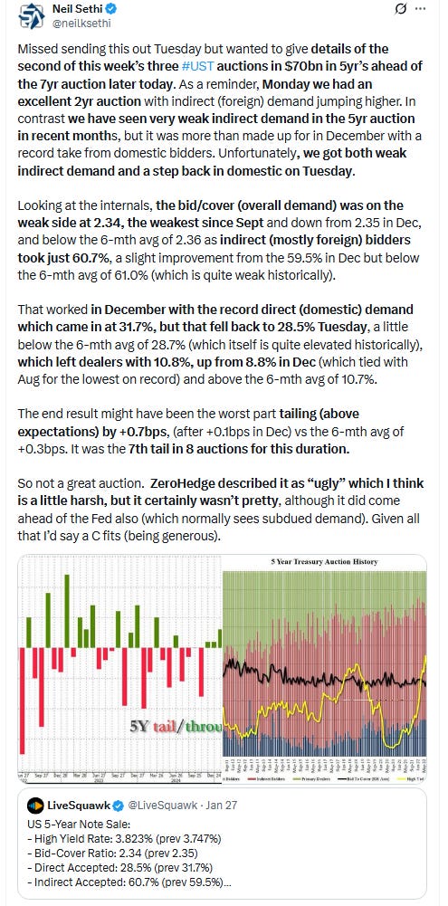 Pricing for 2026 +1bps to 48bps (it had fallen as low as 44bps Jan 21st), with pricing for one cut 90%, two cuts 62% and three cuts 29% (down from 68bps Dec 3rd (and 80bps mid-Nov which was highest we’d been for 2026 cuts)).