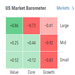 Morningstar style box continued to be mixed with today growth lagging although again no style moving more than 1%.