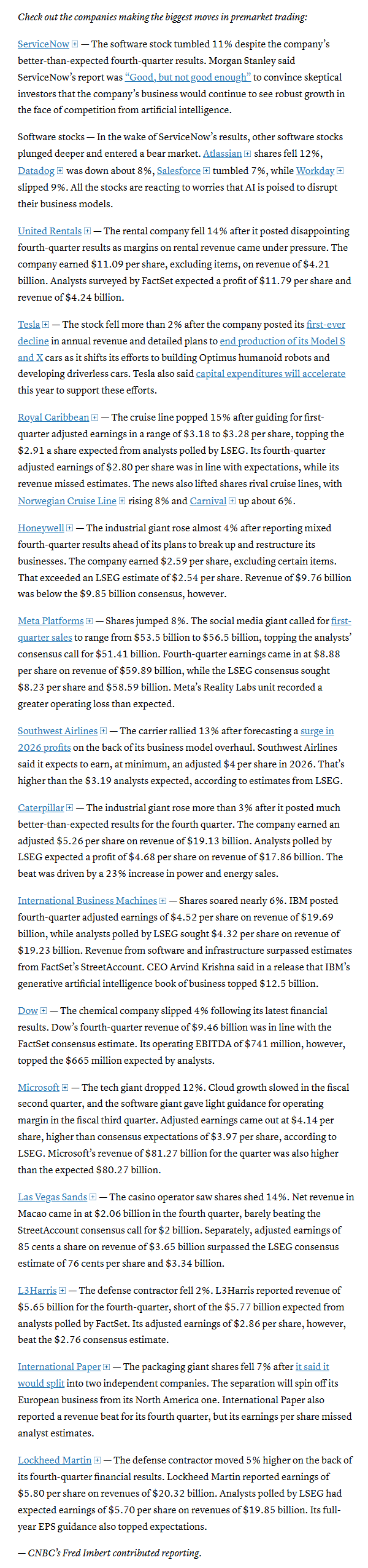 On a positive note, Meta Platforms shares jumped more than 10% after the Facebook parent gave a stronger-than-expected first-quarter sales forecast. Elsewhere, Caterpillar shares were up more than 3% after the industrial giant reported fourth-quarter results that easily beat the Street.