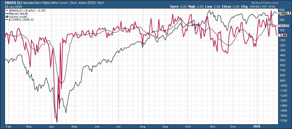 New 52-wk highs minus new 52-wk lows (red lines) were little changed for a four session on the NYSE at 174 (still down from 288 a week ago, the best since Nov ‘24 ), but fell to -2 on the Nasdaq (down from 490 a week ago, also the best since Nov ‘24).