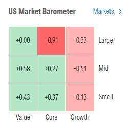 Morningstar style box continued to be mixed this time with growth shares lagging along with large core (perhaps where they house most of the top 11 and financials (more below on them)).