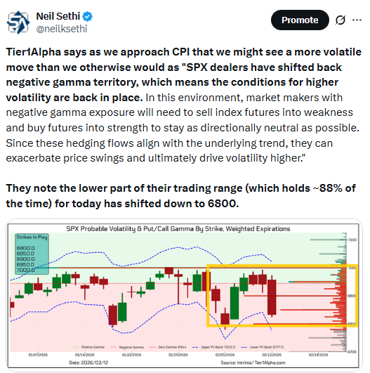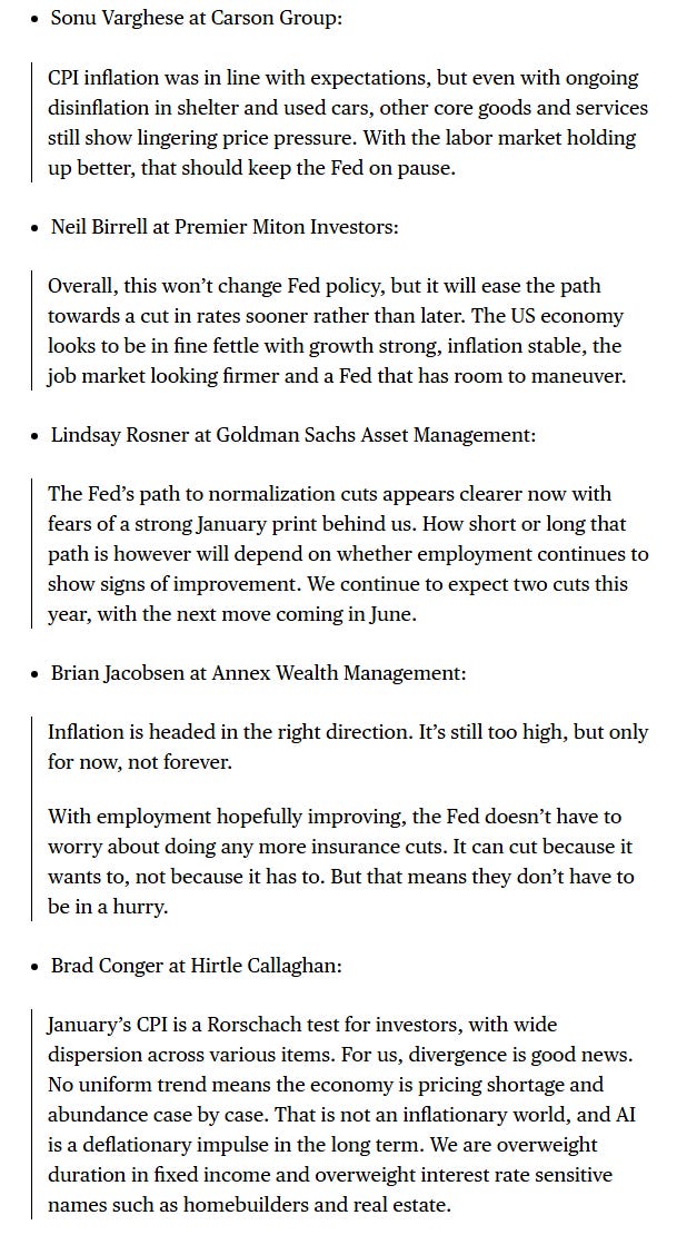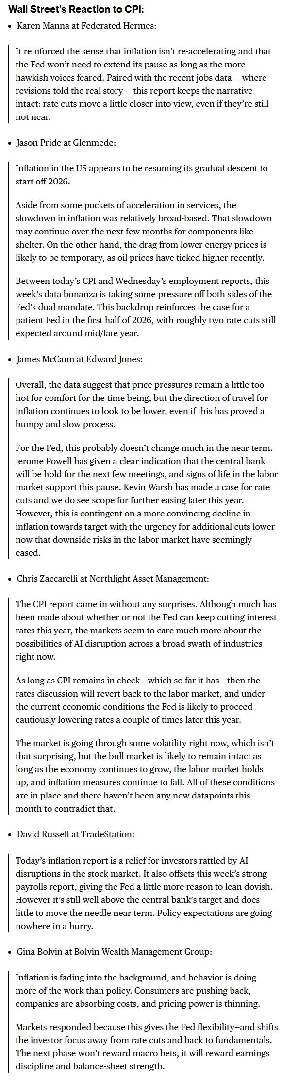 “Today’s inflation report is a relief for investors rattled by AI disruptions in the stock market. It also offsets this week’s strong payrolls report, giving the Fed a little more reason to lean dovish. However it’s still well above the central bank’s target and does little to move the needle near term,” said David Russell, global head of market strategy at TradeStation. “Policy expectations are going nowhere in a hurry.”