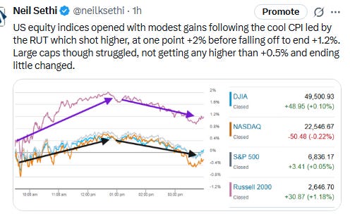 US equity indices opened today’s session modestly higher, for a third day (pre-market) led by small caps (Russell 2000 (RUT)), following a slightly cooler than expected CPI report which showed headline consumer inflation at +0.2% m/m in January, and +2.4% on an annualized basis, both a tenth below expectations. The more important (for the Fed) core CPI though was in line with expectations at +0.3% on the month and +2.5% year over year which was still though the least since 2021 (full report link below). Bonds gained (yields lower hitting the lows of the year) and Fed rate cut bets were boosted (all covered in the subscriber section).