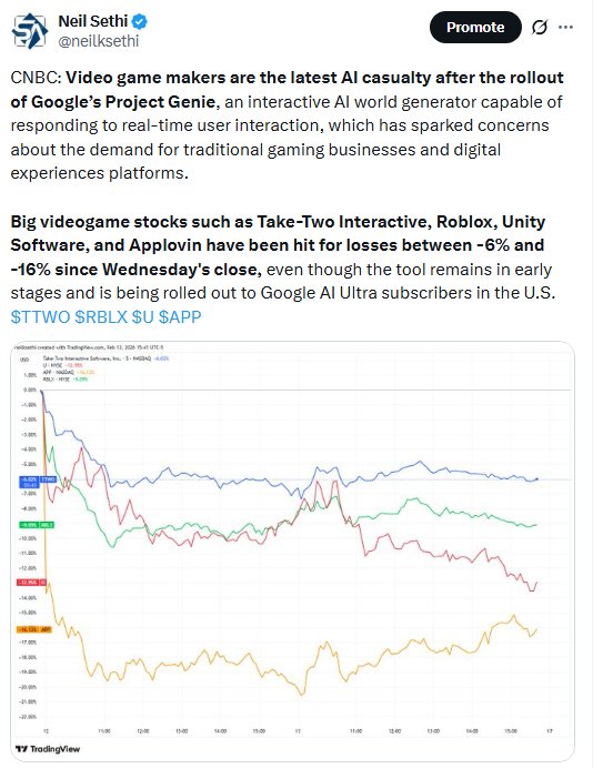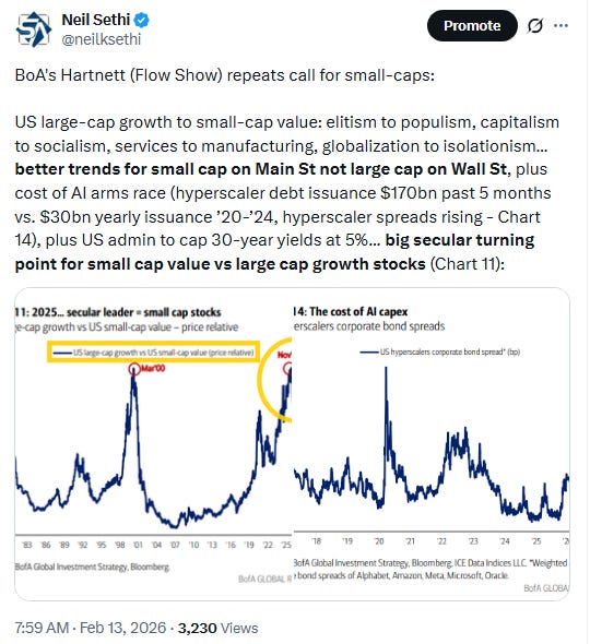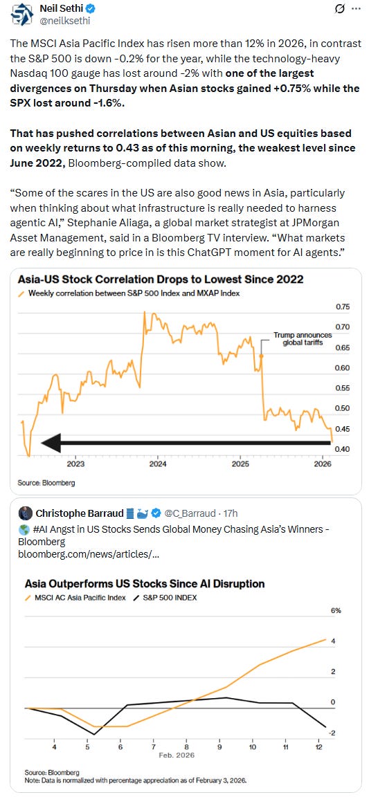 “Investors show no mercy for anything seen as an AI loser. The list is growing by the day, driving divergence between new/old economy sectors and U.S./[Rest Of World] equities,” said Barclays analyst Emmanuel Cau. “Amid erratic price action and fears of AI disruption turning into a broader macro/credit issue, growth, rates & earnings backdrop is okay.