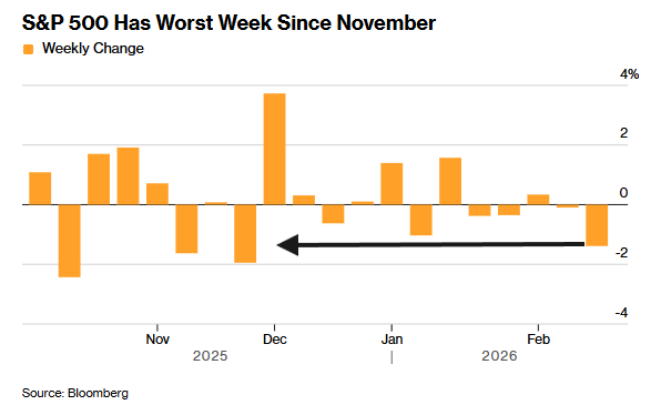 AI disruption fears rattled the market this week, spreading beyond the sell-off seen in software and into real estate, trucking and financial services. Financial stocks Charles Schwab and Morgan Stanley fell 10.8% and 4.9% this week, respectively, while software stock Workday dropped 11% in the period. Shares of commercial real estate firm CBRE lost 16% week to date.