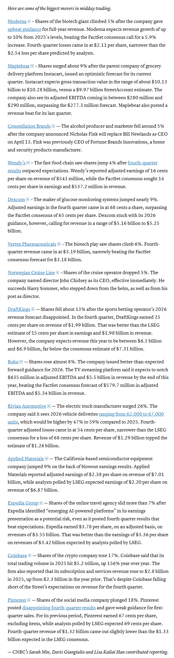 Instacart climbed after the company issued a strong outlook for the start of 2026 that far exceeded analyst expectations, signaling sustained demand for its grocery delivery services.