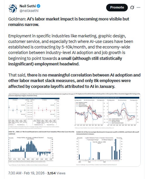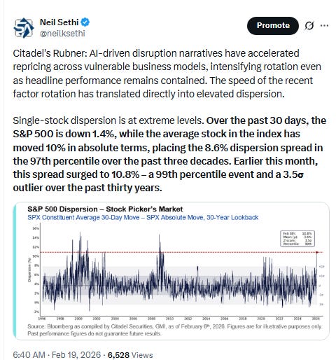 “A rebound in mega‑cap stocks, along with a pause in the rotation and broadening theme that has defined market performance this year, would not be surprising in the weeks ahead,” said Edward Jones senior global investment strategist Angelo Kourkafas. “Selling has been broad and indiscriminate, and in some cases, valuations may already reflect a substantial degree of disruption risk relative to current fundamentals,” he added. To be sure, Kourkafas said that even as pessimism in the tech sector has likely become overstated, the prospect of the group “regaining sustainable leadership remains doubtful” as the macroeconomic environment continues to favor cyclical stocks.
