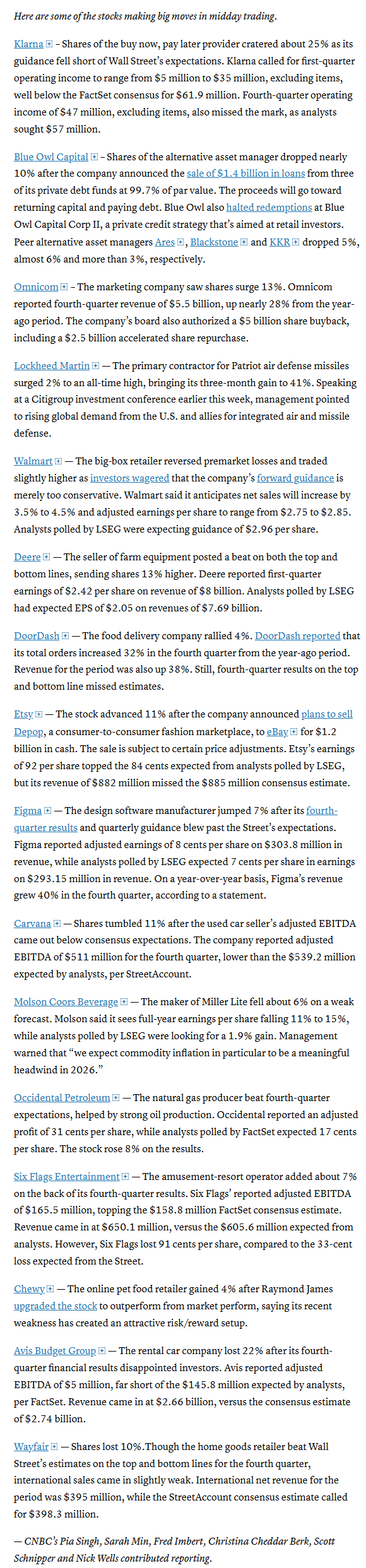 Investors moved out of private credit stocks after private market and alternative assets manager Blue Owl Capital announced it’s going to tighten investor liquidity following its sale of $1.4 billion in loan assets, spurring worries among investors about losses in the murky private loans area. That stock declined about 6%, while others such as Blackstone and Apollo Global Management were each down more than 5%.