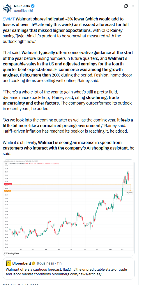 Adding to the downbeat sentiment Thursday, Walmart shares were down more than 1% after the company’s full-year earnings outlook fell short of expectations. This overshadowed better-than-expected results for the fourth quarter.