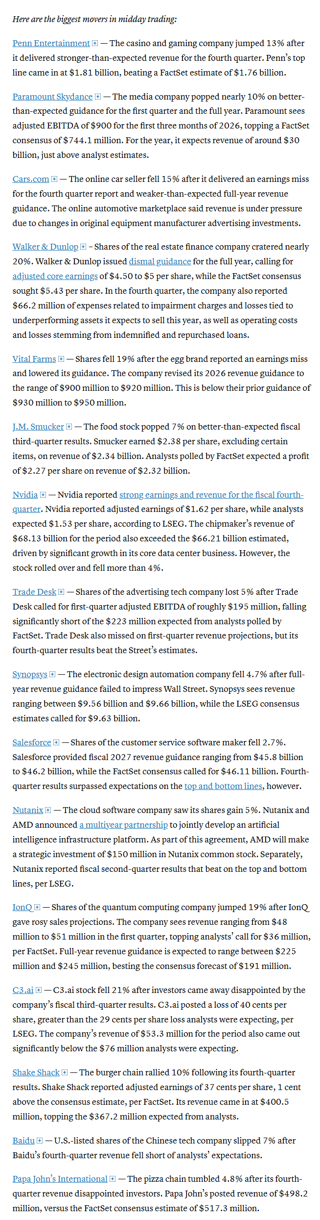 Paramount Skydance Corp. shares jumped 10% after reporting better-than-anticipated sales and earnings, days after submitting a new bid to buy Warner Bros. Discovery Inc. Rival bidder Netflix Inc. advanced 2.3%. After hours Netflix said they are giving up their pursuit of Warner Brothers after the Paramount bid was "deemed superior".