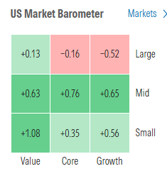 Morningstar style box mostly green Thurs with the largest caps getting the weakest results.