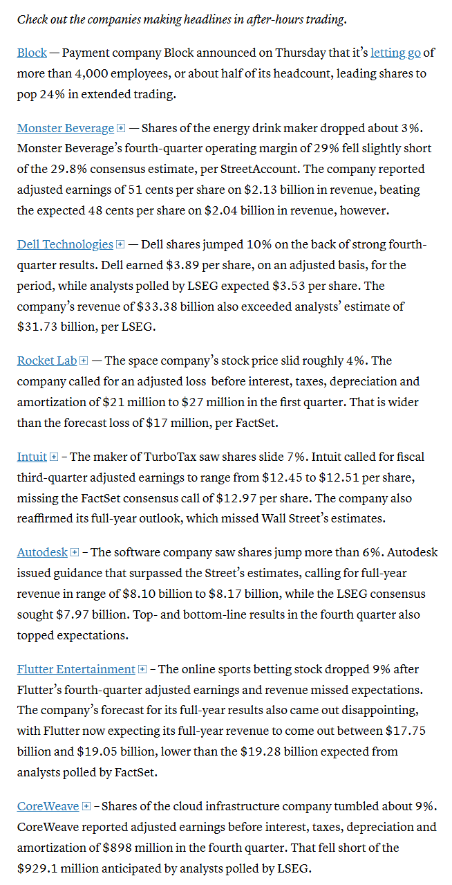 Also in late hours, Dell Technologies Inc. gave an outlook for sales of its AI servers that exceeded estimates sending shares higher. Jack Dorsey’s Block Inc. is cutting 4,000 employees, reducing its workforce by nearly half as the financial technology firm places a bet on AI changing the future of labor productivity which also saw shares jump, while CoreWeave Inc., an operator of AI data centers, reported a bigger loss than anticipated seeing shares fall.