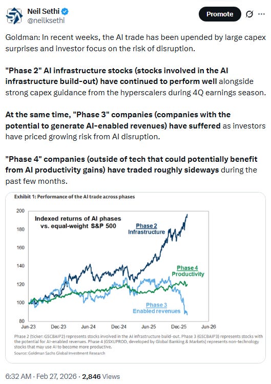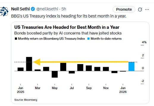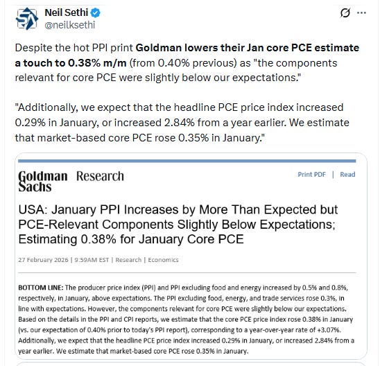 However any inflation concerns were more than offset by those around a recession following financial services firm Block announcing Thursday that it’s laying off more than 4,000 employees, or nearly half of its workforce, in a pivot to AI (and was rewarded with shares up 20%). Another credit blowup in a UK mortgage firm that ensnarled a number of US financials just added to concerns. That came after a BlackRock private debt fund cut its dividend, and a private credit fund overseen by Apollo Global Management marked down the value of its assets. 10-year Treasury yields fell to the lowest since October and 2-year yields the lowest since Aug ‘22 as Fed rate cut bets jumped (but most notably for 2027 (more on all that in the subscriber section)).