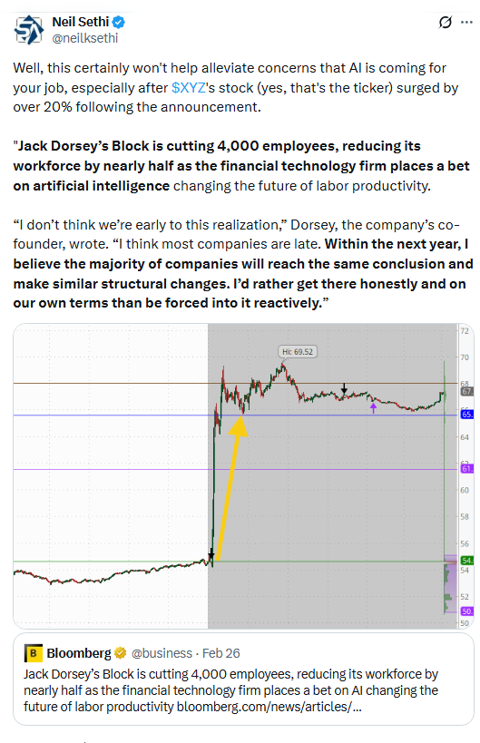 Block Inc. said it was reducing its workforce by nearly half in a bet on AI. Jack Dorsey’s firm also raised its outlook for gross profit.