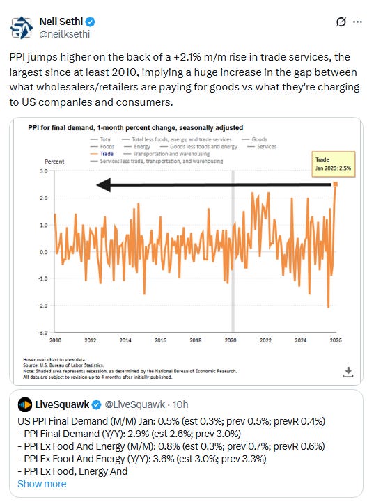 Stephen Kolano, chief investment officer at Integrated Partners, views the PPI report as an additional complication for investors on top of the already-existing anxieties surrounding not just AI capex and the risk of its disruption to industries but also other factors such as stress in the private credit market. Noting that the inflation reading seems to be more services driven, he thinks it’s a sign companies are possibly starting to pass through the cost of tariffs to the end consumer in order to maintain their margins. “Inflation isn’t solved yet,” he said, adding that it creates this conundrum for the Federal Reserve of deciding whether to cut interest rates to spur growth or to hold steady to continue to fight inflation. “It just creates this uncertainty around which way is policy going to go in the remainder of the year.” That’s not to mention the state of the labor market as another worry, Kolano said. Even though job growth last month was much better than expected, the investment chief said he isn’t sure that the labor market is stabilizing given that layoffs have been picking up. In fact, Challenger, Gray & Christmas reported earlier this month that layoffs in January hit their highest total for that month since the global financial crisis. “I don’t see a clear sign that unemployment is not going to move higher just yet,” he said.