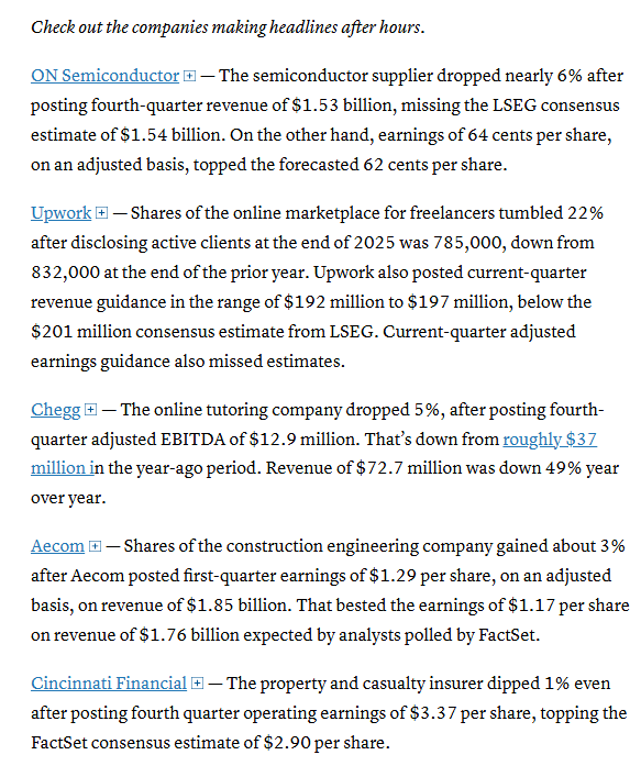 For each report, a “Goldilocks” outcome that implies solid growth and stable price pressures is the best case for the market, helping support stocks, according to Tom Essaye at The Sevens Report. “Economic data has been almost perfectly Goldilocks since the government re-opened in late November and that needs to continue to help stocks weather rising AI skepticism,” Essaye noted.