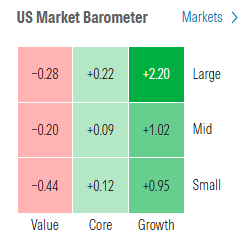 Morningstar style box a neopolitan look with growth outperforming, value lagging.