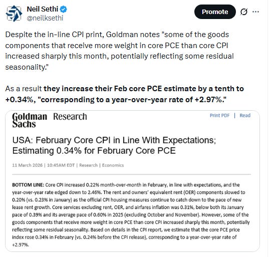 The good news is that February's CPI released on Wednesday "was very much inline with expectations," said Art Hogan, chief market strategist for B. Riley Wealth. "The bad news is that March’s inflation data is going to be a harder pill to swallow, as it will reflect the effects of the war with Iran," he wrote in an email.