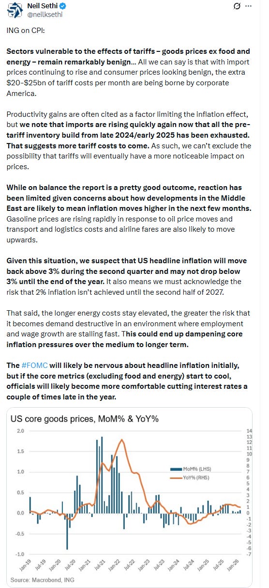 While investors are far more focused on how the conflict in Iran feeds into inflation over the months ahead, the latest inflation data offers some reassurance that underlying price pressures were not moving in the wrong direction before the latest energy shock, according to Seema Shah at Principal Asset Management. “The Fed has historically looked through energy‑driven price spikes,” she said. “But with inflation having sat above target for almost five years, it may be harder to do so this time.” Her base-case remains two rate cuts in the second half of the year, though that outlook would be at risk if energy prices remain high and the conflict drags on.
