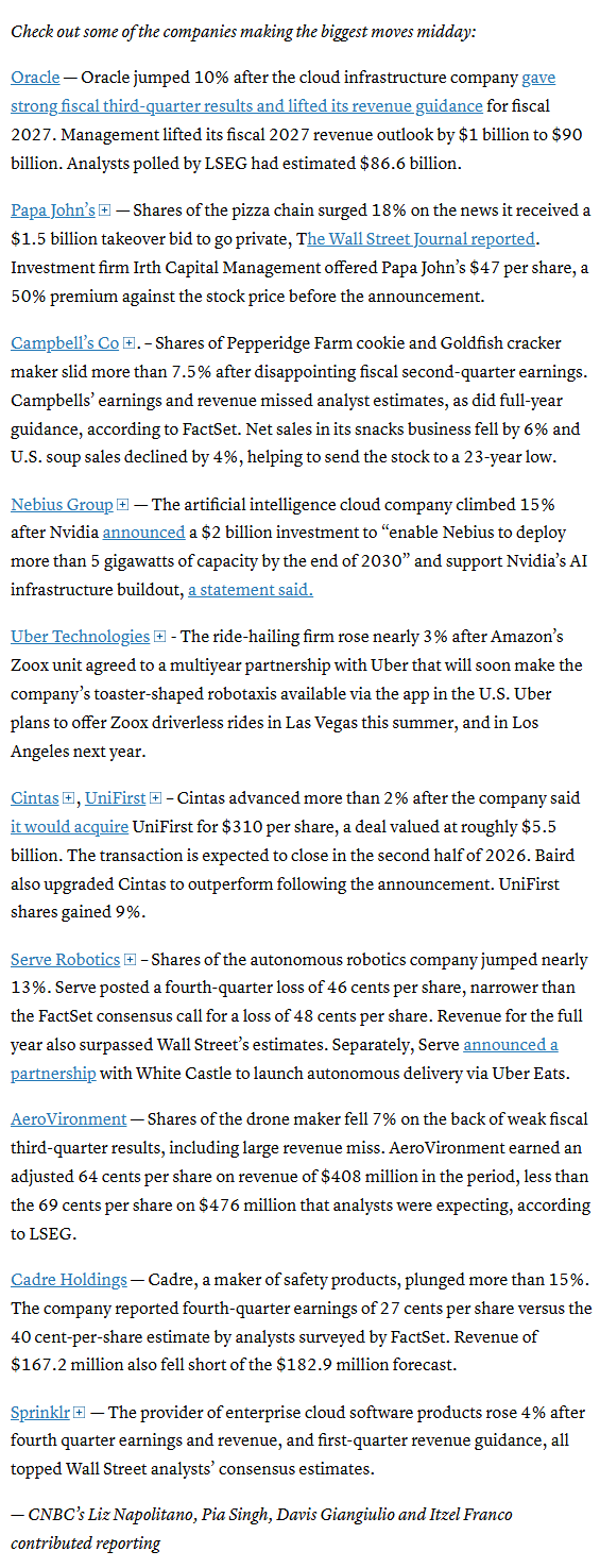 Oracle shares though were a bright spot Wednesday, jumping 9% after the software vendor’s earnings and revenue for the fiscal third quarter exceeded analysts’ expectations. The company also raised its fiscal 2027 revenue forecast.