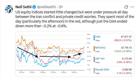 US equity indices opened trading Wednesday again with modest declines despite the consumer price index for February (so pre-Iran conflict), coming in as expected excluding food and energy at a tame 0.2% from January. From a year ago, it was unchanged at 2.5% — the slowest pace in nearly five years. Link is to my blog post summary.