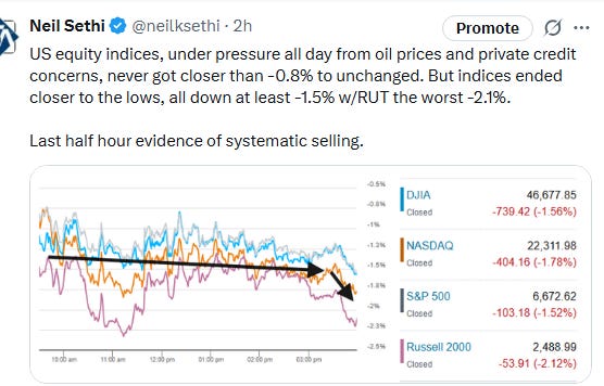 On the private credit front, Deutsche Bank flagged a $30 billion exposure to the sector. That added to pressures on financials, but the losses were broad with the industrial sector seeing its worst day since April, and all of the top 10 largest stocks other than Walmart closing lower. Indices never got closer than -0.8% to unchanged, and they ended closer to the lows than the highs, all down at least -1.5% with the small cap Russell 2000 the worst -2.1%.