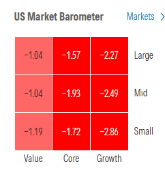 Morningstar style box shows no style losing less than -1% with all the growth styles more than -2%.