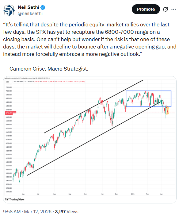 “It’s telling that despite the periodic equity-market rallies over the last few days, the SPX has yet to recapture the 6800-7000 range on a closing basis. One can’t help but wonder if the risk is that one of these days, the market will decline to bounce after a negative opening gap, and instead more forcefully embrace a more negative outlook.” — Cameron Crise, Macro Strategist,