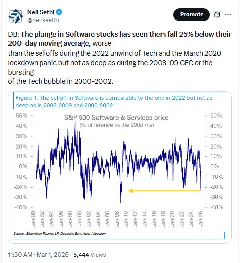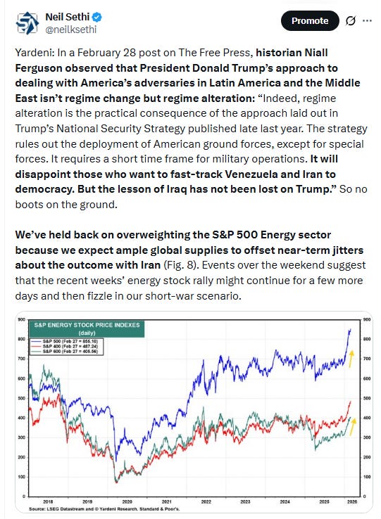 “The attack on Iran is no reason to sell stocks, in our view,” he says. But that doesn’t mean he’s a bull. “We see the questioning of the returns on AI capex, and the related disruption of the U.S. software sector, and the resulting collateral damage for private equity and price credit, as better reasons to be bearish.”