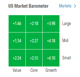 Morningstar style box saw strong gains across the board led by growth bouncing back after underperforming the prior three sessions.