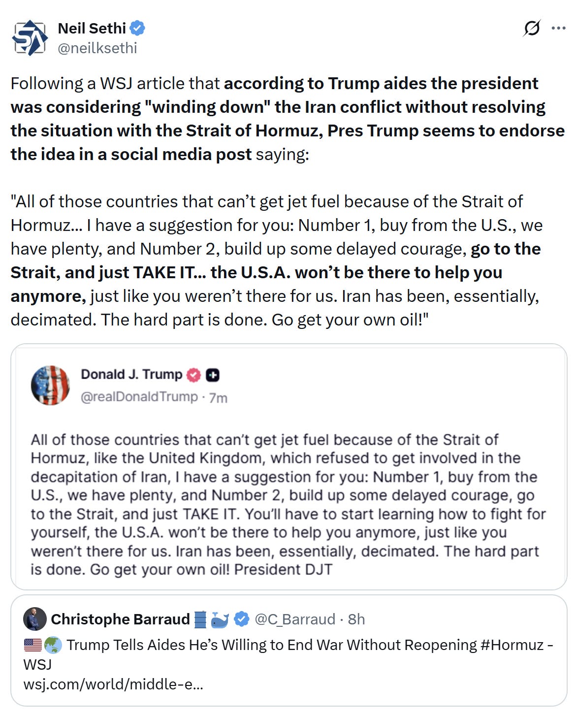 US equity indices opened trading Tuesday like Monday solidly higher, initially on a WSJ article that reported Trump aides said the president was considering "winding down" the Iran conflict even without resolving the situation with the Strait of Hormuz, and getting another lift after Pres Trump seemed to endorse the idea in a social media post saying: "All of those countries that can’t get jet fuel because of the Strait of Hormuz... I have a suggestion for you: Number 1, buy from the U.S., we have plenty, and Number 2, build up some delayed courage, go to the Strait, and just TAKE IT... the U.S.A. won’t be there to help you anymore… Go get your own oil!"