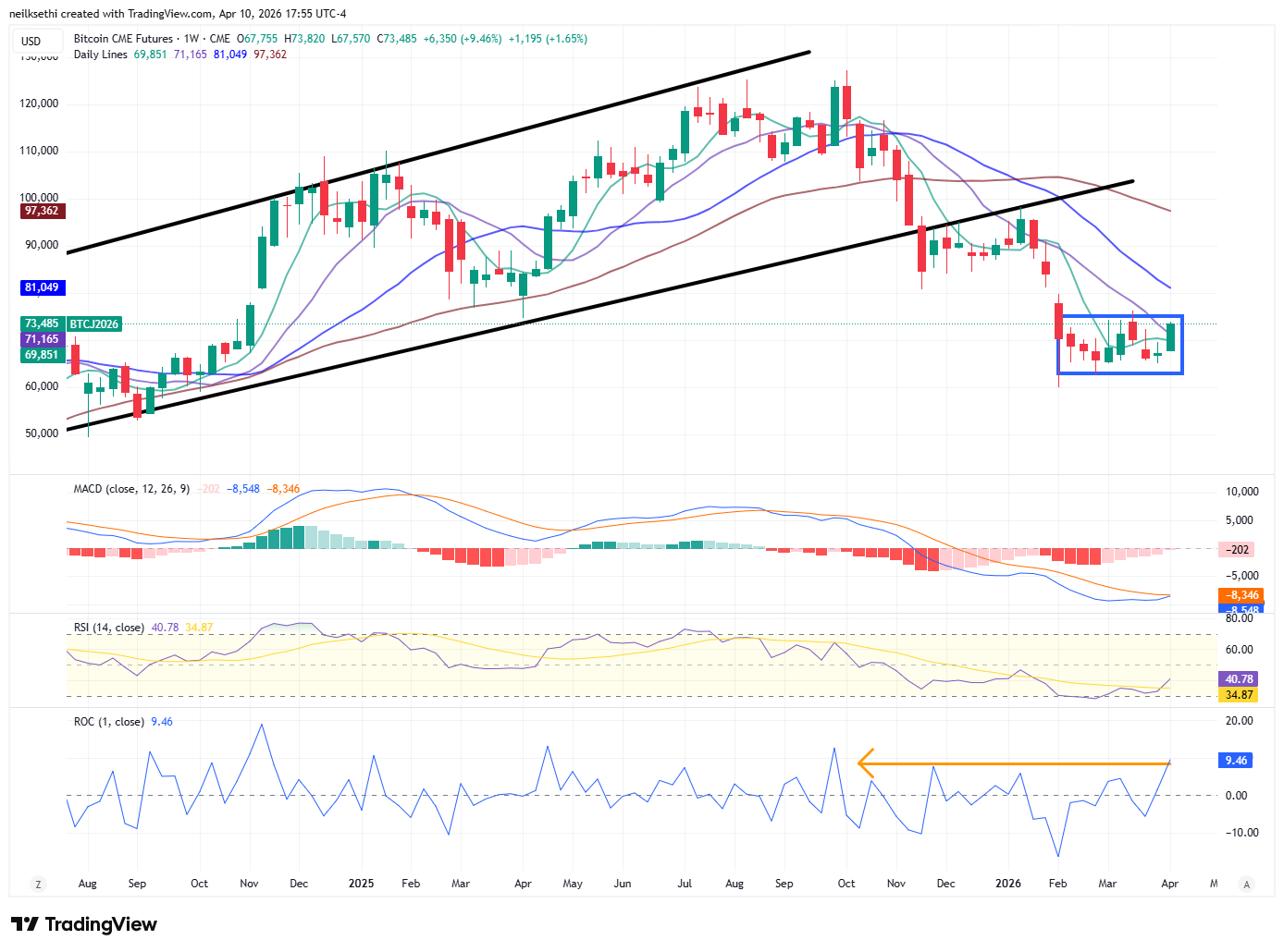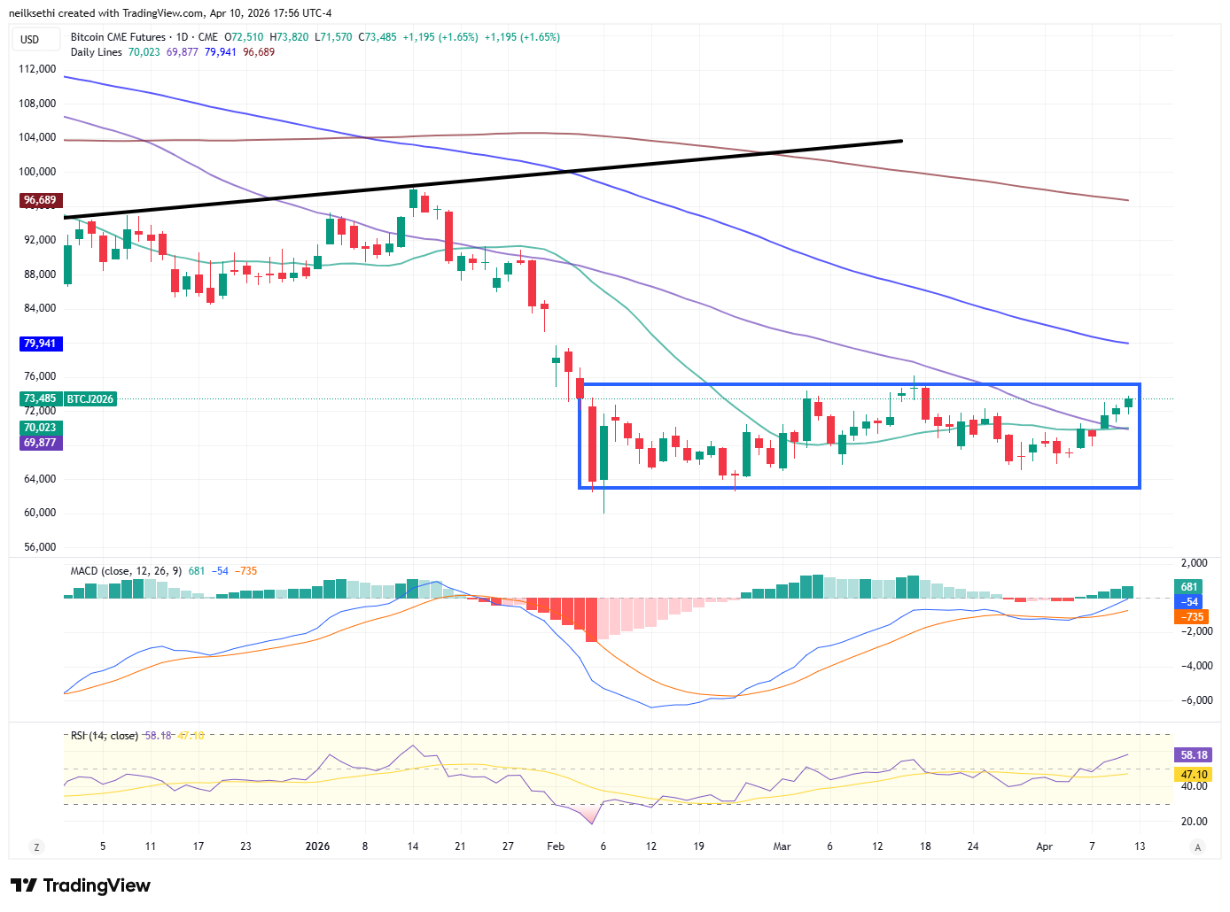 Bitcoin futures up for a third session to the highest close in three weeks, moving towards the top of the range since the start of February (the blue box). The daily MACD remains in a “cover shorts” reading, and the RSI is back over 50, plus it cleared the 50-DMA so as I mentioned Wed, “we could see it test the top of the range again at least.”