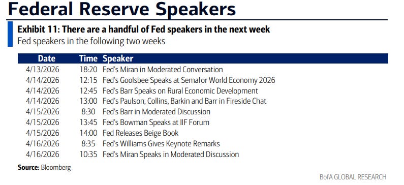 Lots of Fed speakers ahead of the policy speaking blackout starting Friday night with Gov’s Barr, Bowman, Waller, and Miran and regional Fed Presidents Collins, Barkin, Paulson, and Williams (Collins and Barkin are not voters this year). We’ll also get the Fed’s Beige Book prepared for the April meeting which will give us an update on what they’ve been hearing from their regions.