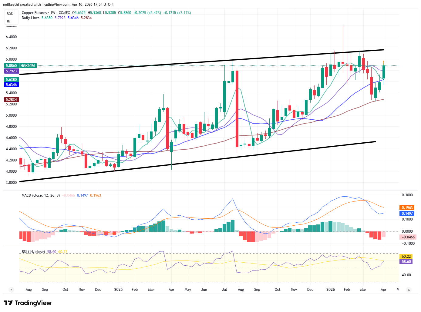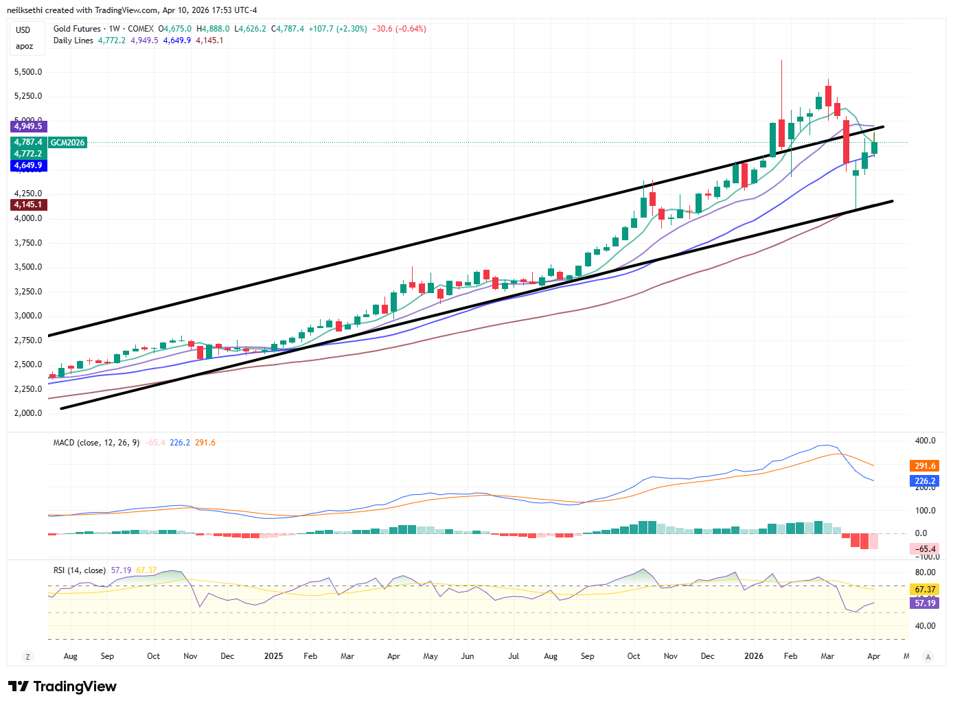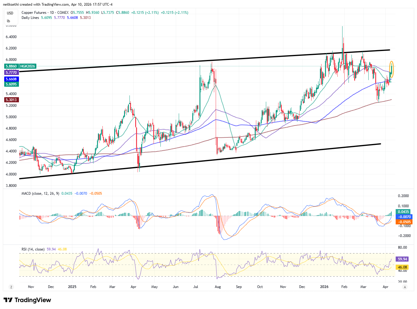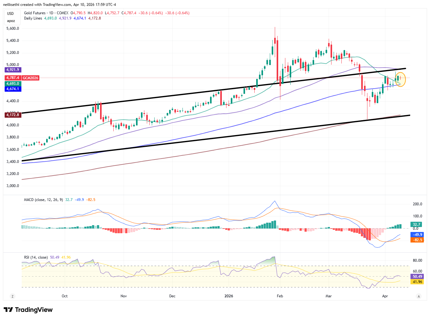 Gold futures (/GC) fell back from a three-week high. For now, they remain in their old channel from early 2024 that they left at the start of 2026 for a couple of months. The technicals are favorable with the MACD in a “cover shorts” reading although the RSI softened back towards 50.