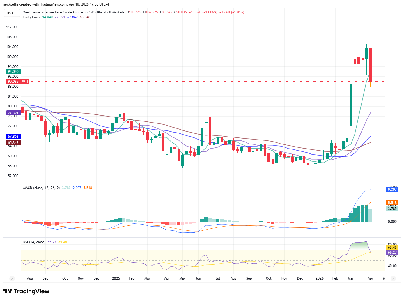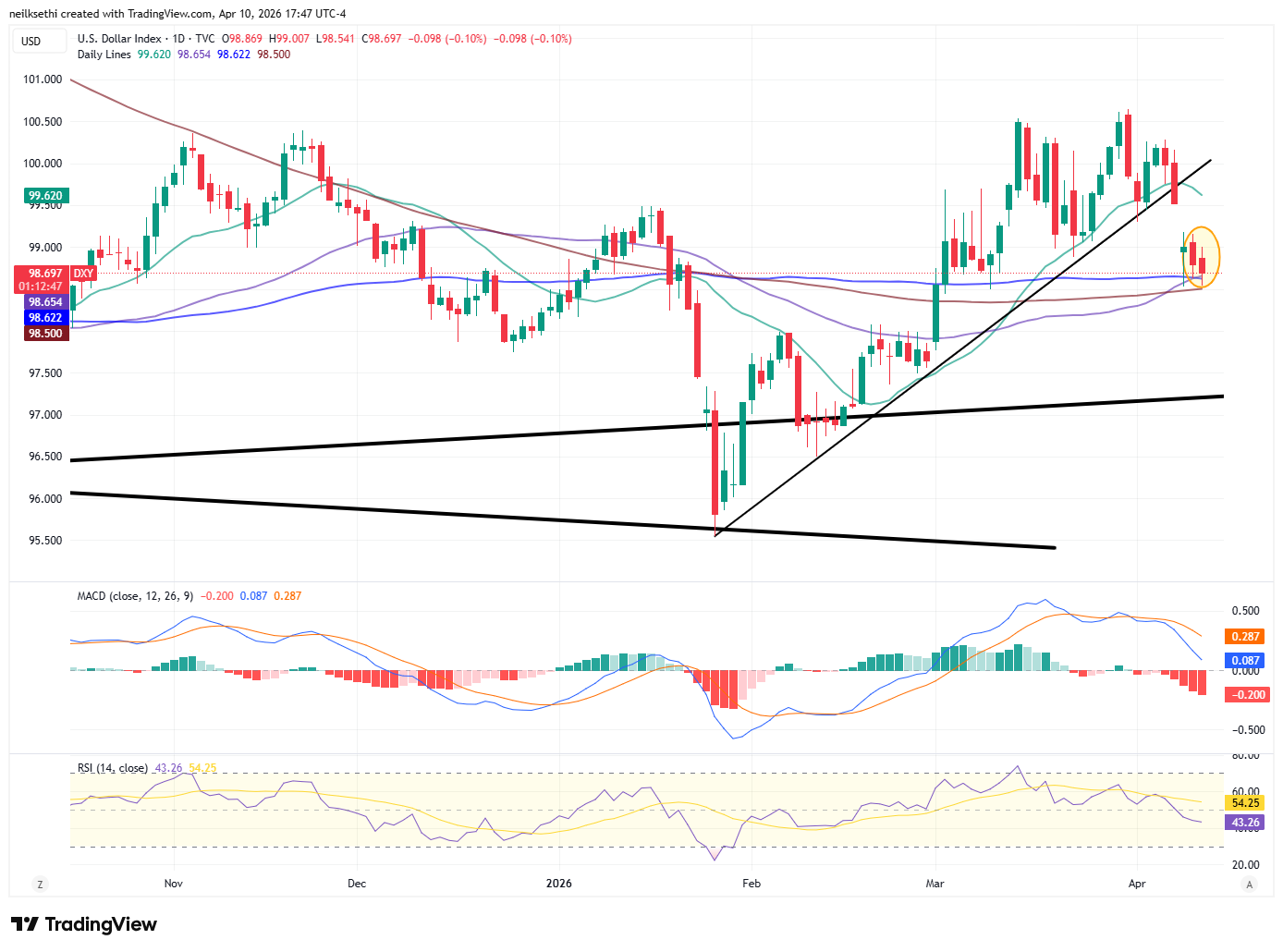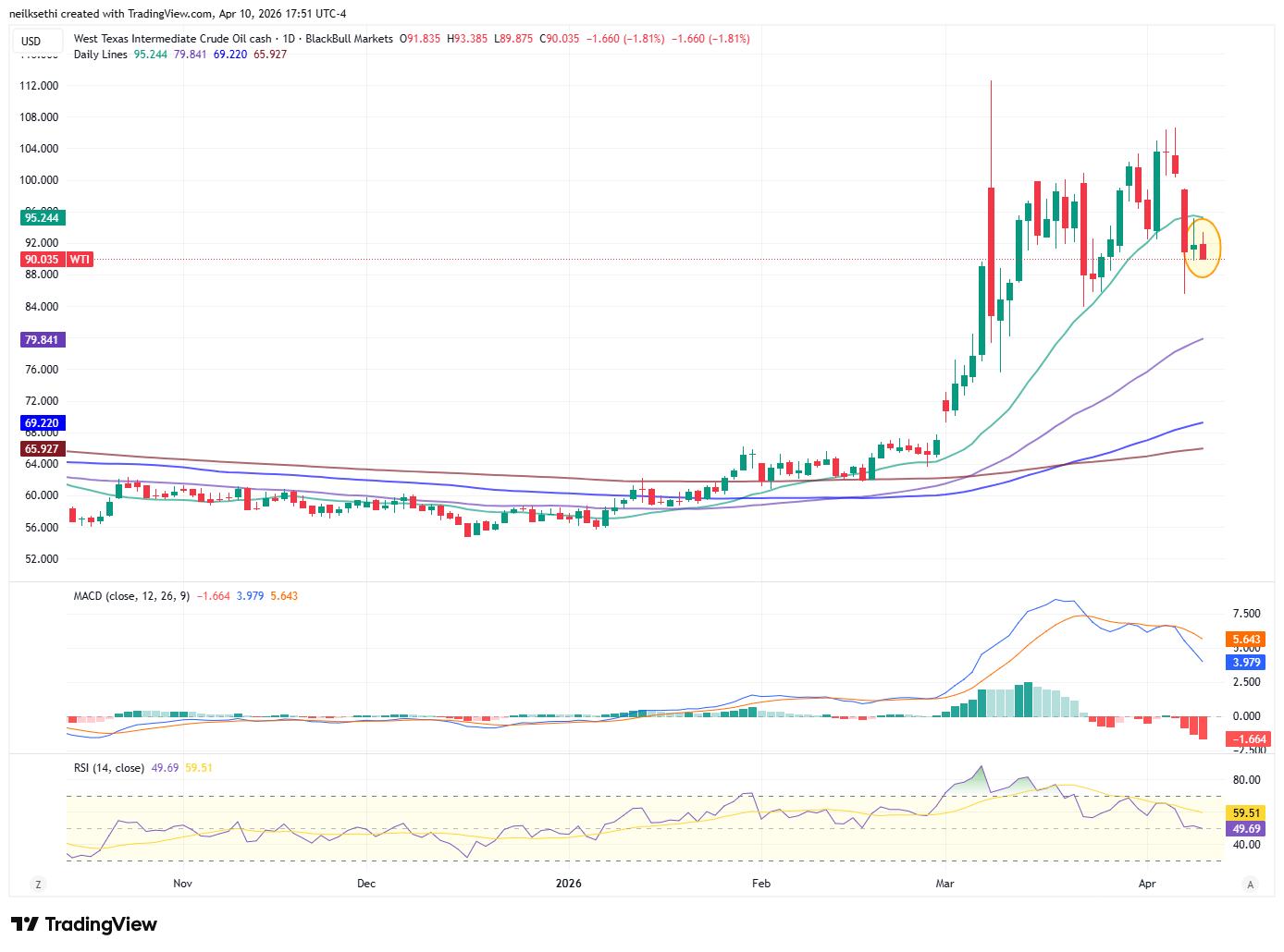 WTI fell back to a 2-week low. As noted Wed, it’s broken its uptrend line and as mentioned a couple of weeks ago the technicals are not favorable. As I said Wed, “its path from here likely depends mostly on whether the ceasefire holds and the Strait of Hormuz reopens.”