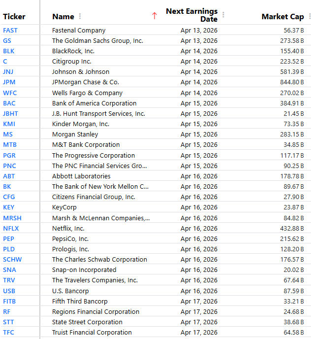 SPX earnings reports come back into center stage though with 1Q reporting season unofficially starting. We’ll get ~30 SPX components reporting, with an emphasis on Financials, and 14 >$100bn in market cap in GS, WFC, JNJ, BLK, C, JPM, BAC, MS, PGR, ABT, PEP, NFLX, PLD, SCHW (in order of earnings date).