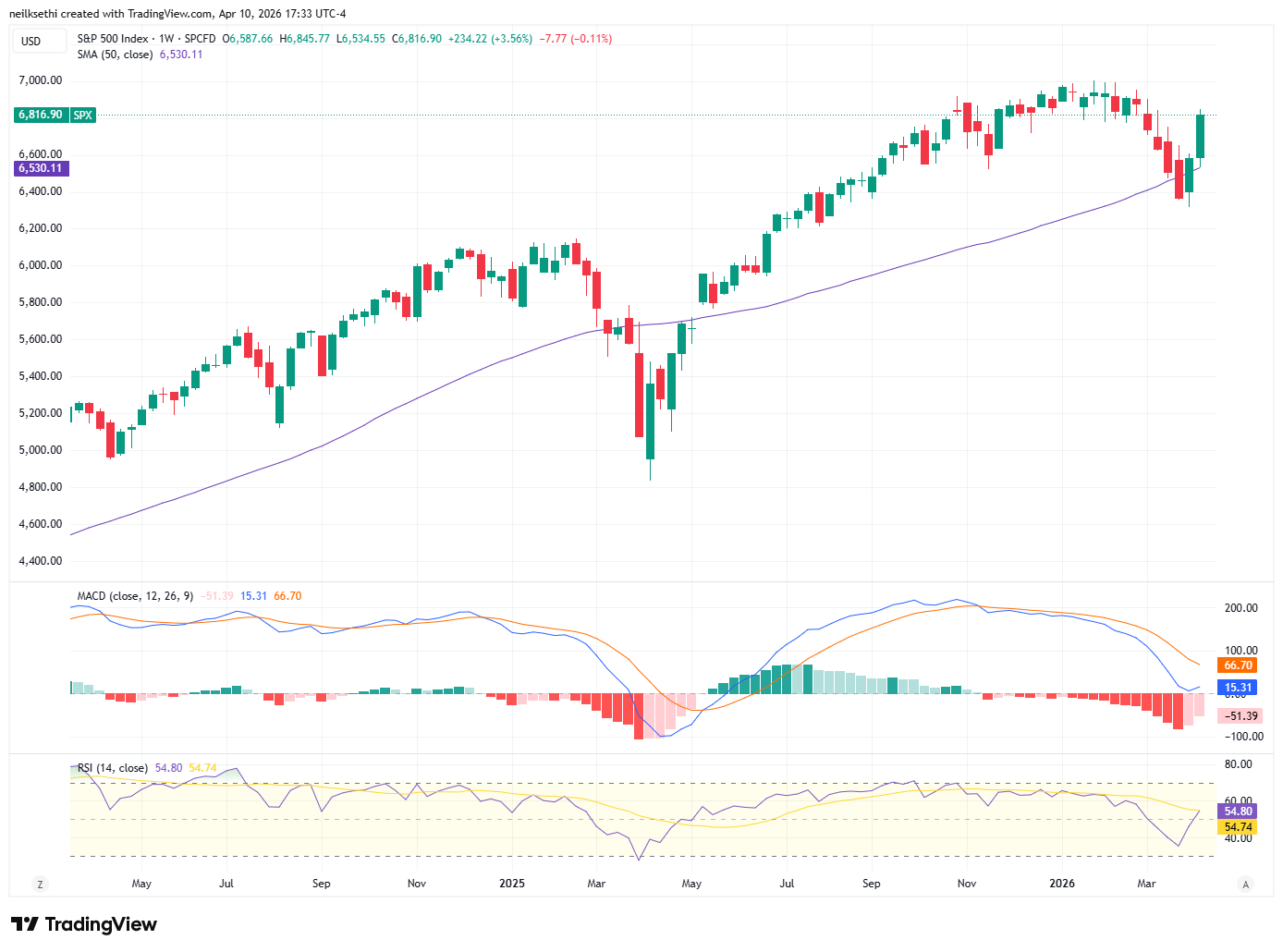 Indices would fall back, and while the Nasdaq would recover, the S&P 500 (SPX), Russell 2000 (RUT), and Dow Jones Industrial Average (DJIA) would all fall into the red. For the week, though, all saw solid gains with the SPX, DJIA, and Nasdaq all seeing their best weeks since November at +3.6%, +3%, and +4.7% respectively. The RUT was the best since early January +4%.