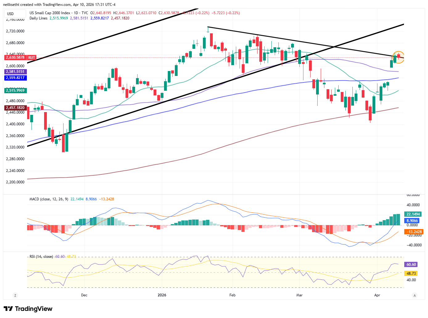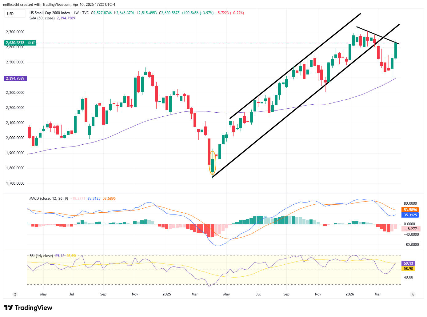 RUT (Russell 2000) I have described the past few weeks as “easily the best looking chart of the three,” and one that as I mentioned Wednesday “I should have bought when it broke over its downtrend line, but I didn’t want the headline risk pre-ceasefire (as fragile as it remains).” As noted then, “now through all of the major moving averages but getting stopped at one last trendline (from the all-time highs) that it needs to clear.” It seems to be moving through it now.