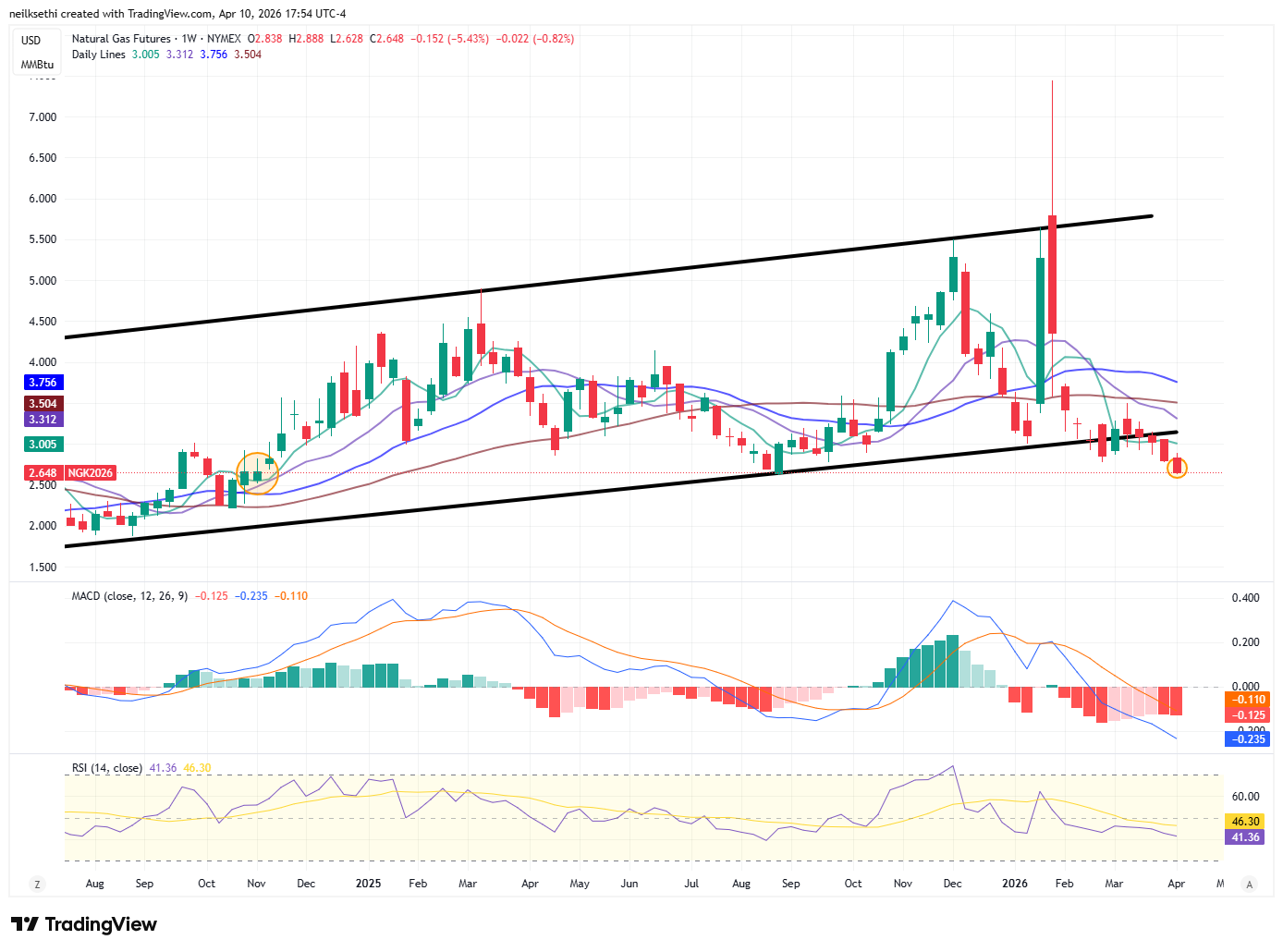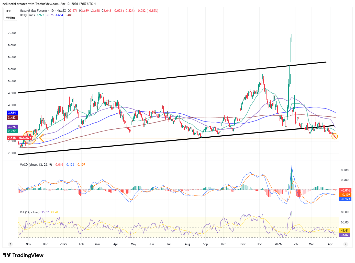 US natural gas futures (/NG) fell to the least since Nov 2024. The daily MACD is into a “go short” reading, and the RSI is under 40, so as I said last week “not much to get excited about, particularly with winter in the rear-view mirror.”