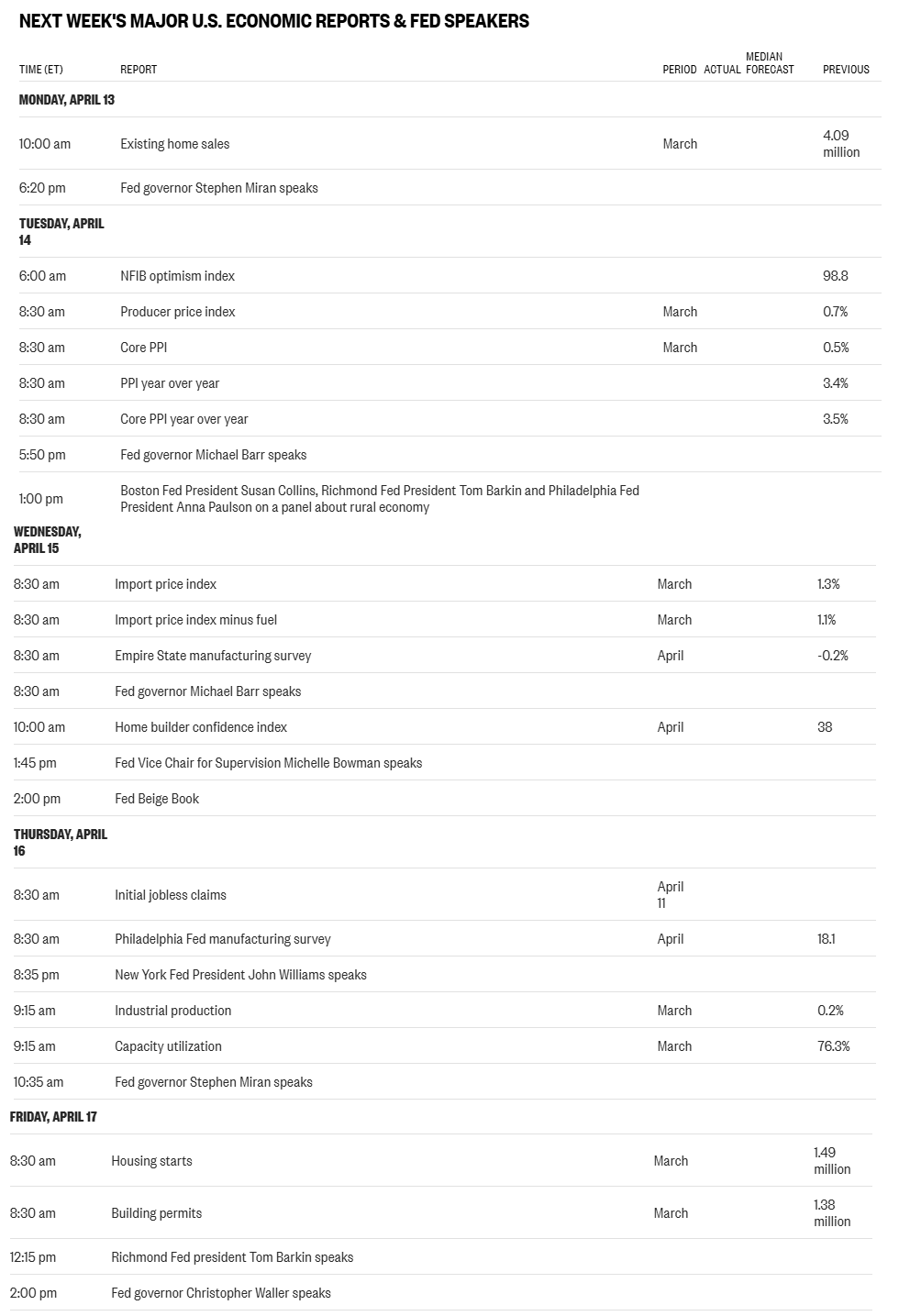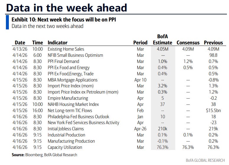 US economic data remains relatively heavy next week although mostly second or third tier data with March PPI, import prices, industrial production, housing starts/permits, existing home sales, NAHB home builder sentiment, and NFIB small business sentiment in addition to some regional Fed PMIs and the weekly reports (ADP, jobless claims, mortgage applications, EIA petroleum inventories, etc.).
