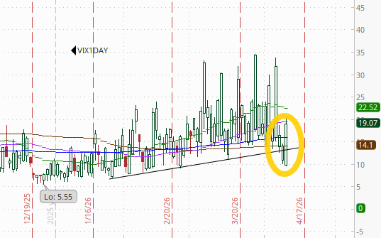 With what promises to be a headlined filled weekend ahead, the 1-day VIX jumped to 19.1, but that’s the lowest week-end read since the Iran conflict began. It’s consistent with a move of 1.19% in the SPX next session.