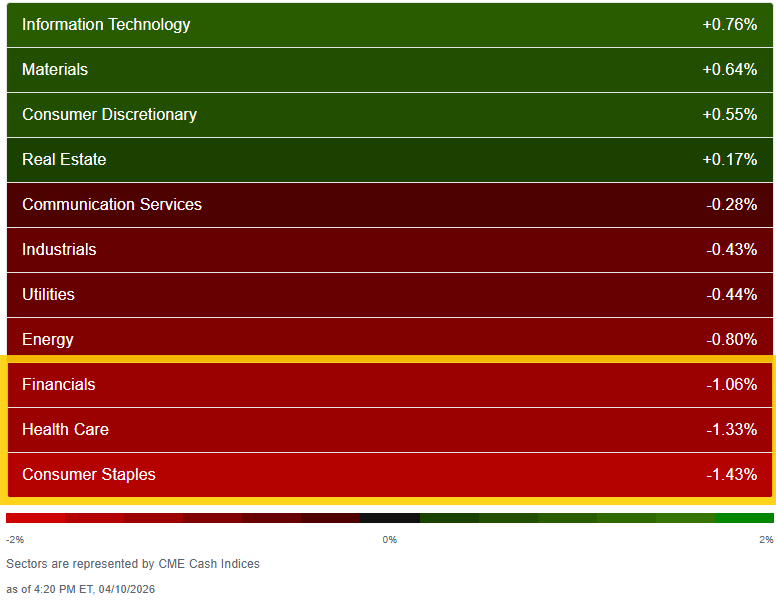 The materials (+0.6%) and real estate (+0.2%) sectors also captured gains, while the other seven S&P 500 sectors finished lower including the financials sector (-1.1%), but major banking names such as Goldman Sachs (GS 907.80, +4.08, +0.45%) and Citigroup (C 124.36, -0.56, -0.45%) were among the more resilient components ahead of their earnings releases next week.