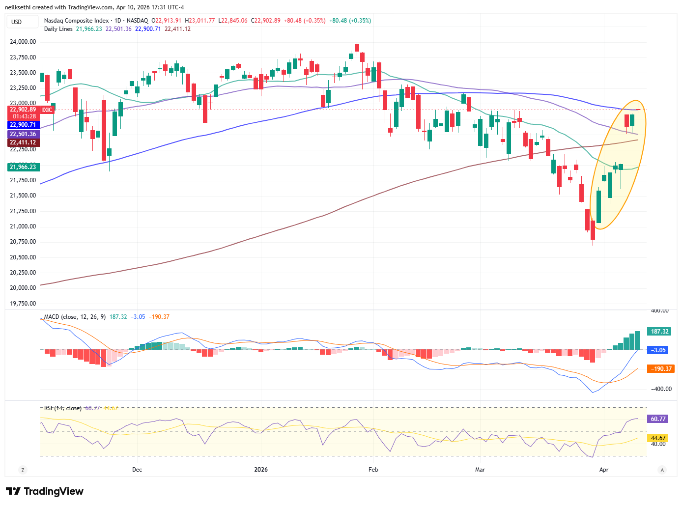 The Nasdaq Composite did get its 8th strait session which took it over its 100-DMA but not quite the 23,000 level noted Wed, so not yet pulling the trigger there.