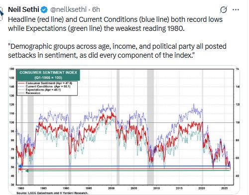 Consumer sentiment continued to deteriorate into early April hitting a record low as 1-yr inflation expectations jumped, but long-run expectations were more contained.