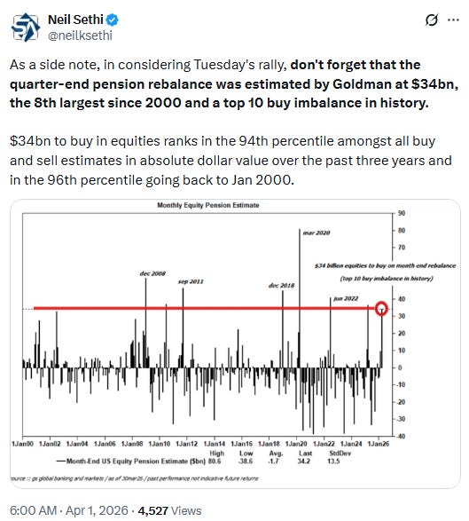 Also this morning, we got the ADP employment report for March which came in slightly better than expected, led by outsized job growth in the smallest (under 20 employee) businesses, February retail sales, which also came in slightly better than expected with broad spending growth, and ISM manufacturing services PMI which was the strongest since 2022 but on the back of a jump in delivery times to the longest since then (and input prices were the highest since then as well).