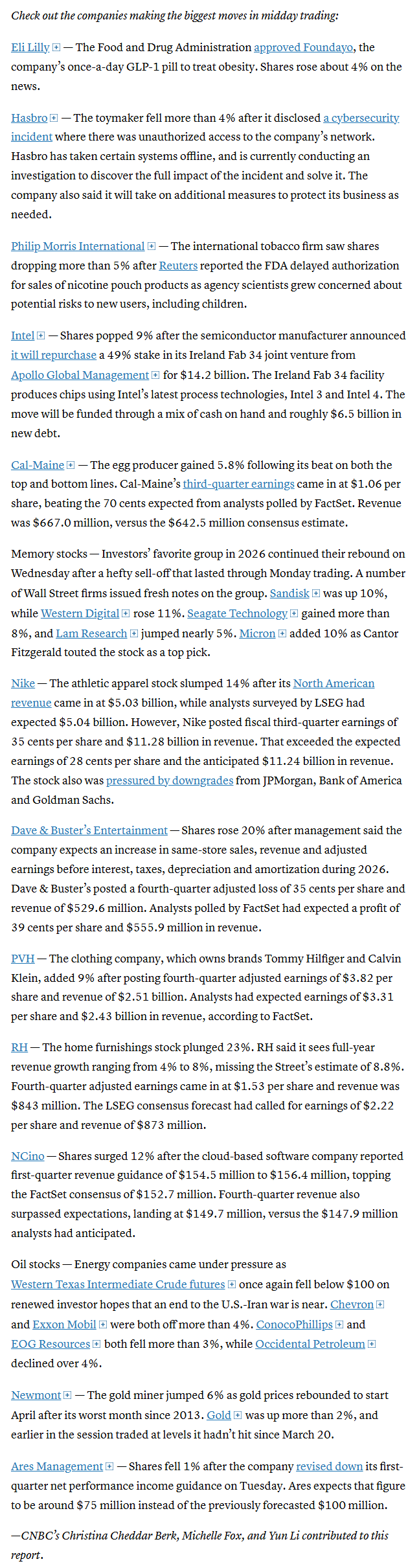 US equity indices opened trading Wednesday solidly higher with tech shares again leading gains following the updates in last night’s Markets Update including President Trump saying last night the U.S. would leave Iran in “two or three weeks,“ and that “[w]e’ll leave whether we have a deal or not. It’s irrelevant,” he said. That was followed this morning though with a social media post where the President signaled that perhaps opening the Strait is a requirement to end the conflict: “Iran’s New Regime President, much less Radicalized and far more intelligent than his predecessors, has just asked the United States of America for a CEASEFIRE! We will consider when Hormuz Strait is open, free, and clear. Until then, we are blasting Iran into oblivion or, as they say, back to the Stone Ages!!!” Perhaps we’ll learn more after his address tonight discussed in the Day Ahead portion below.